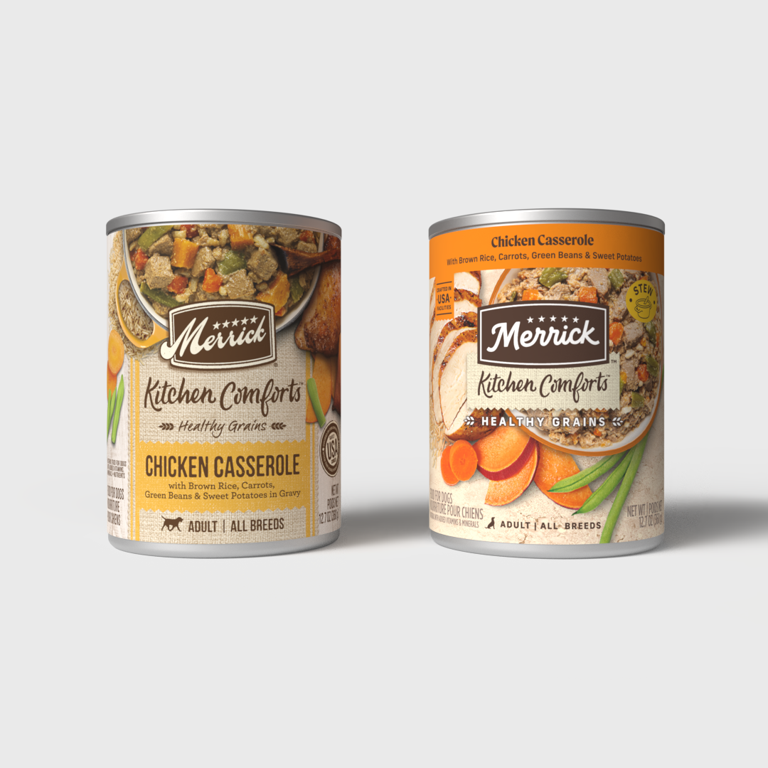 Strategic packaging redesign created to align the canned portfolio with Merrick’s updated “real ingredients” brand story. The visual system shifts the focus heavily toward bold, close-up food photography, allowing the ingredients to take center stage and reinforcing the authenticity of the product in a more immediate, impactful way.
